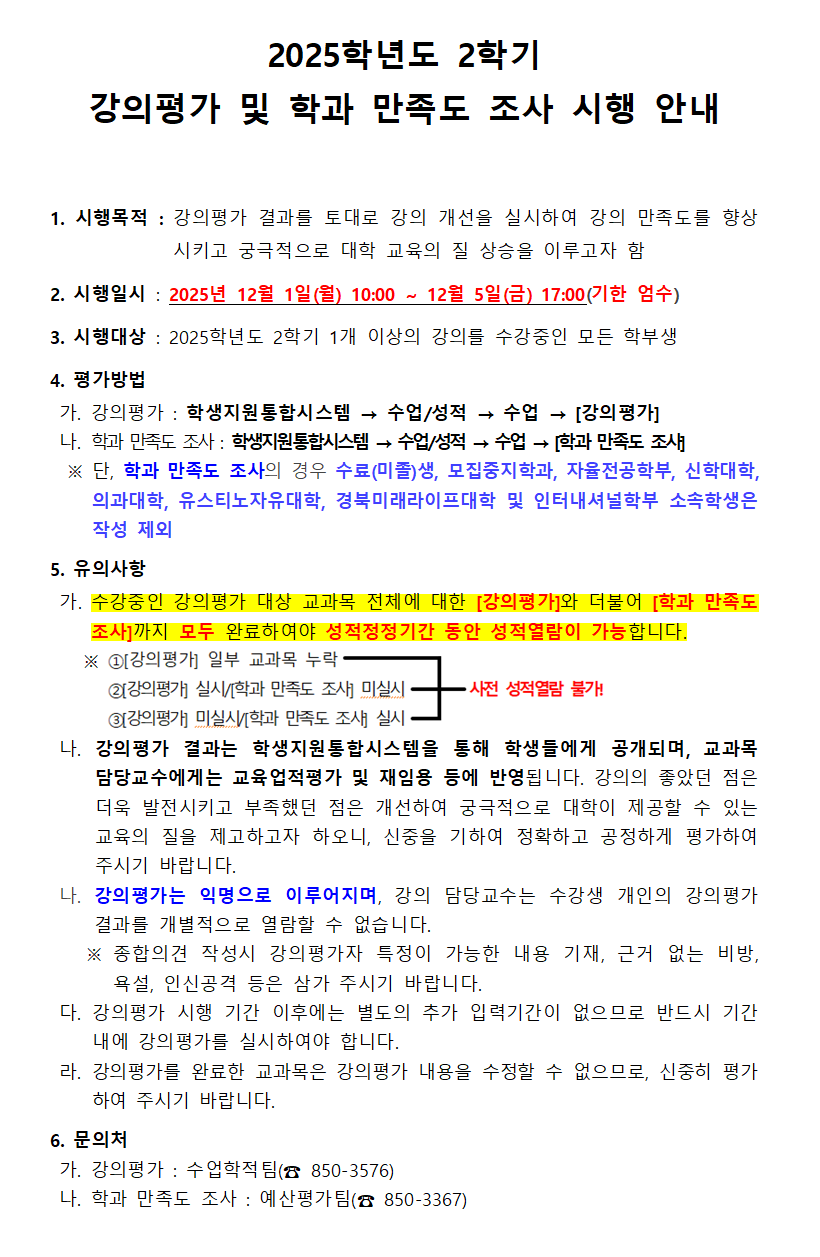 2025학년도 2학기 강의평가 및 학과만족도 조사 실시 안내
