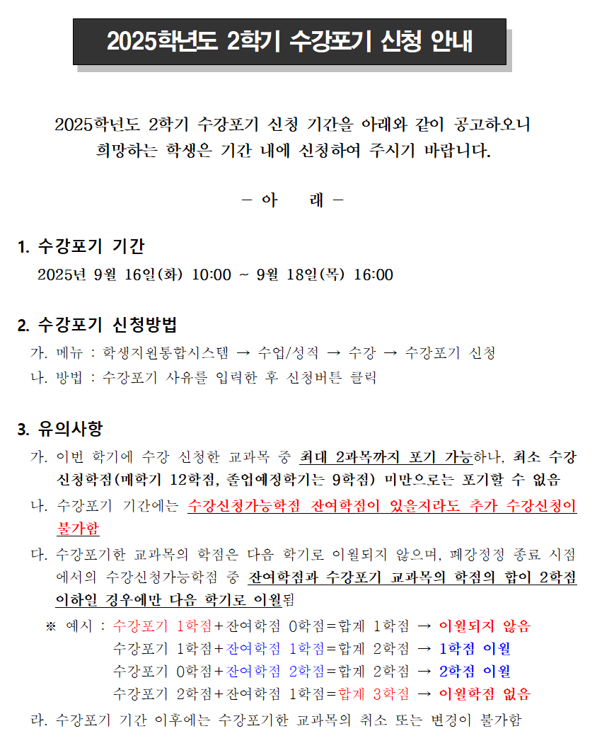 2025학년도 2학기 수강포기 신청 안내